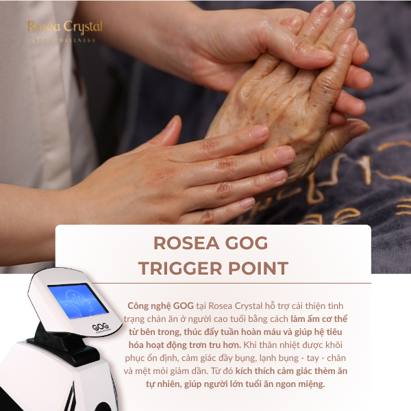 Điểm đặc biệt, liệu trình Rosea GOG Trigger Point là sự kết hợp giữa công nghệ hiện đại, hoạt động dựa trên cơ chế cộng hưởng năng lượng sóng sinh học GOG, kết hợp massage Thụy Điển và trị liệu điểm kích hoạt (Trigger Point), thao tác trị liệu nhẹ nhàng và nhịp chăm sóc chậm rãi, rất phù hợp với người cao tuổi. Không tạo cảm giác đau, không gây áp lực, liệu trình mang lại sự dễ chịu, dịu êm ngay cả trong quá trình trải nghiệm trị liệu. Khi thân nhiệt được khôi phục về trạng thái cân bằng, cơ thể sẽ tự điều chỉnh lại cảm giác đói no. Từ đó, người cao tuổi ăn uống ngon miệng hơn, giảm đầy hơi, ngủ sâu giấc và tinh thần cũng trở nên thoải mái hơn mỗi ngày.