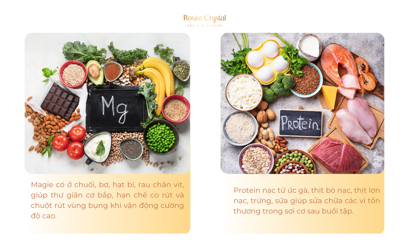 Protein nạc từ ức gà, thịt bò nạc, thịt lợn nạc, trứng, sữa giúp sửa chữa các vi tổn thương trong sợi cơ sau buổi tập. Bên cạnh đó, vi khoáng chất đóng vai trò không kém phần quan trọng. Magie có nhiều trong chuối, bơ, hạt bí, rau chân vịt, giúp thư giãn cơ bắp, hạn chế co rút và chuột rút vùng bụng khi vận động cường độ cao.