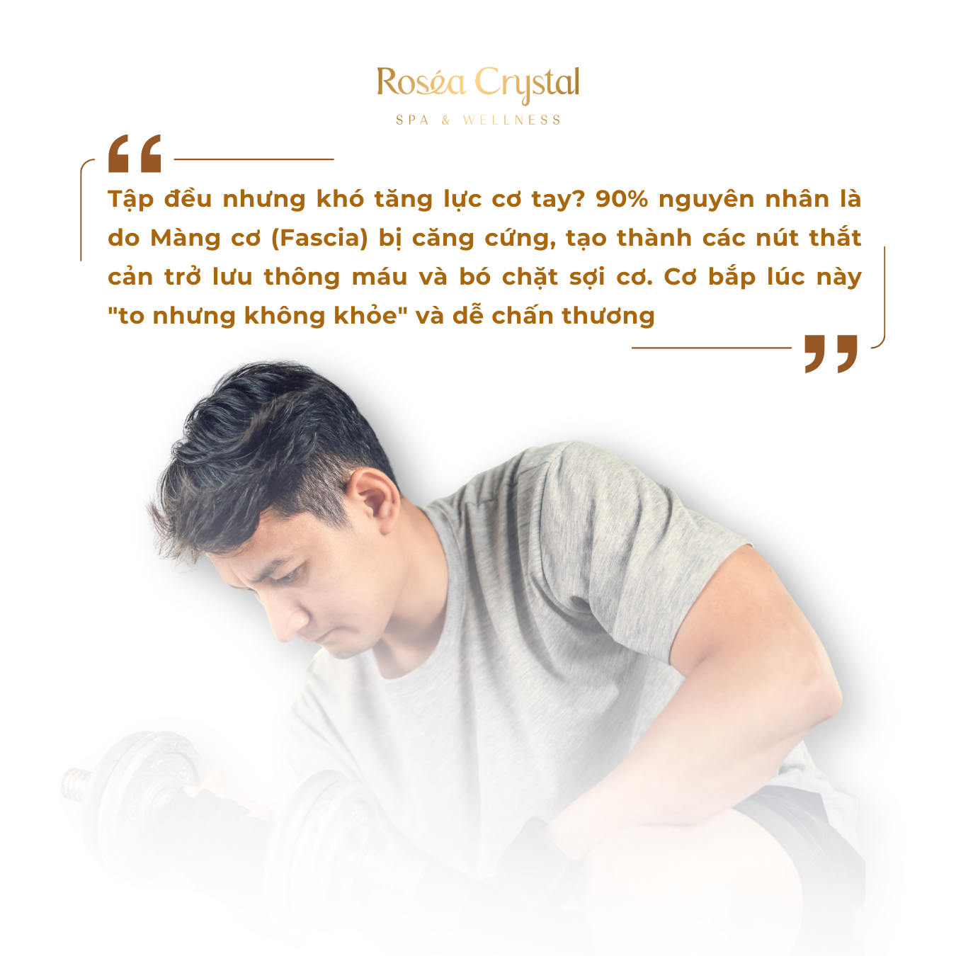 Ngoài các bài giãn cơ chủ động, massage trị liệu phục hồi đóng vai trò quan trọng trong việc giải phóng các điểm co rút sâu. Tại Rosea Crystal, liệu trình massage trị liệu kết hợp công nghệ sóng lượng tử sinh học GOG giúp tác động sâu vào mô cơ, giải phóng hoàn toàn sự căng cứng, phá vỡ các mô sẹo xơ hóa và tăng cường độ đàn hồi cho màng cơ (fascia). Sóng GOG giúp cơ tay mềm hơn, giảm tích tụ axit lactic, từ đó hỗ trợ tăng lực cơ tay cho người tập gym một cách an toàn và hiệu quả.