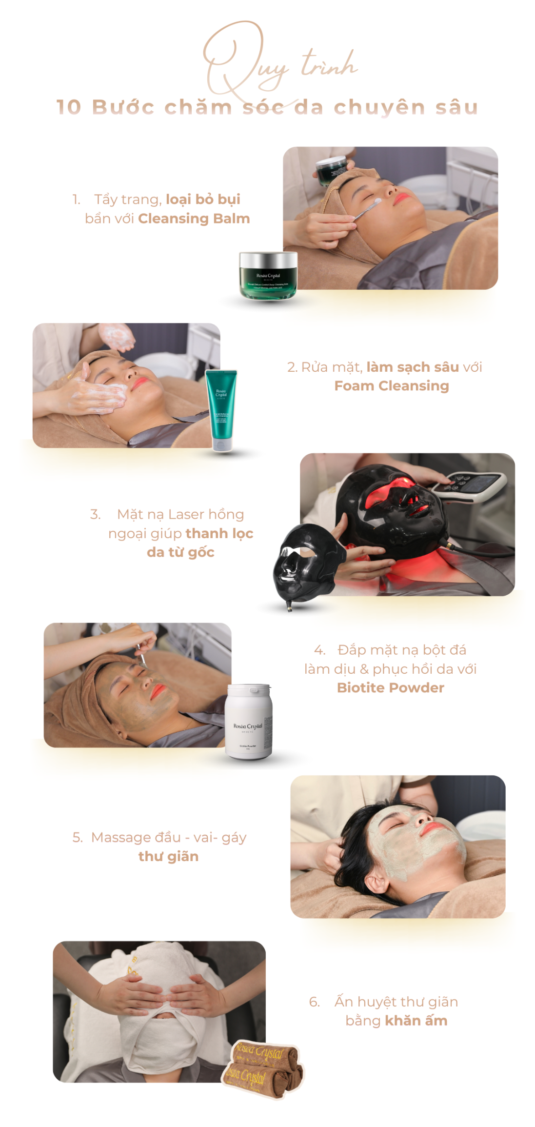 Rosea Crystal với hệ thống chăm sóc sắc đẹp toàn diện với gần 40 chi nhánh trên toàn quốc, mang đến các liệu trình được xây dựng theo tiêu chuẩn chuyên nghiệp. Kết hợp đội ngũ nhân sự được đào tạo bài bản, công nghệ hiện đại và sản phẩm cao cấp sản xuất tại Hàn Quốc trong không gian trang nhã, Rosea Crystal sẵn sàng đồng hành cùng bạn trên hành trình chăm sóc và nâng niu làn da.