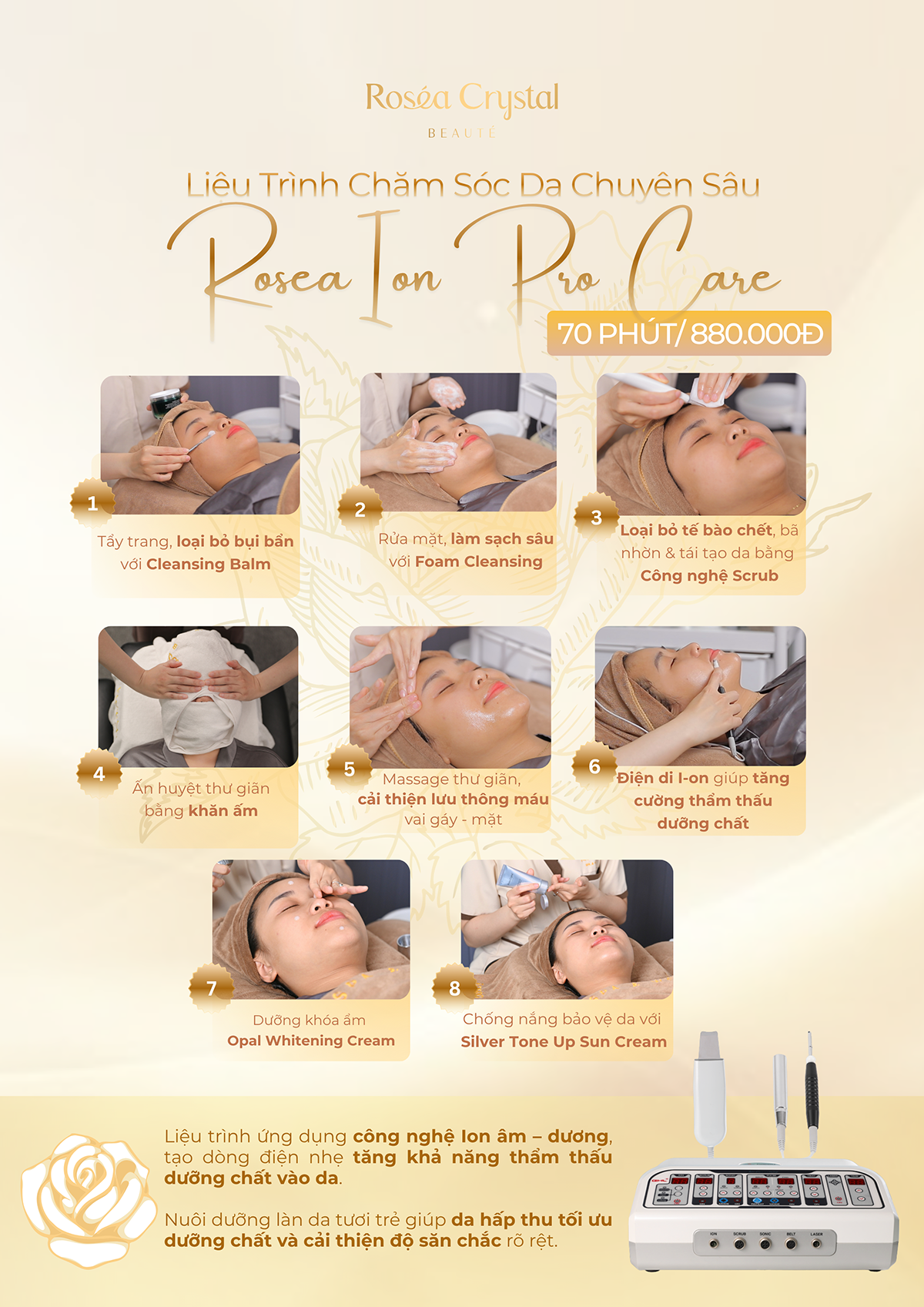 Rosea Crystal mang đến liệu trình Liệu Trình Chăm Sóc Da Chuyên Sâu Rosea Ion Pro Care, giúp phụ nữ Việt Nam tái sinh làn da, xóa mờ dấu hiệu lão hoá và duy trì vẻ đẹp trẻ trung, giữ mãi nét rạng ngời theo thời gian bằng công nghệ hiện đại cùng sản phẩm cao cấp đến từ Hàn Quốc. Liệu trình Rosea Ion Pro Care mang đến khả năng thẩm thấu dưỡng chất vượt trội nhờ các ion dương và âm được sử dụng để tạo ra một dòng điện nhẹ nhàng, giúp đẩy các tinh chất dưỡng da thẩm thấu sâu vào lớp hạ bì, nơi tế bào da hấp thụ tối đa dưỡng chất.
